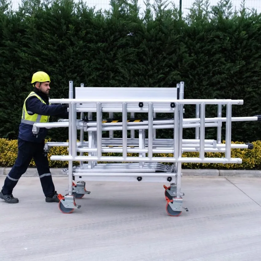 Sí, al tratarse de un andamio plegable, se puede desmontar y plegar ocupando un espacio reducido. Sus dimensiones compactas y sus ruedas con doble freno lo convierten en un andamio pequeño ideal para profesionales que necesitan moverlo entre diferentes obras o almacenarlo en vehículos de trabajo.
