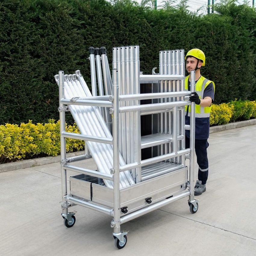 El montaje es rápido y sencillo: en apenas 10-15 minutos una sola persona puede dejar el andamio listo para usar. Esto supone un ahorro importante en mano de obra y tiempo de preparación.